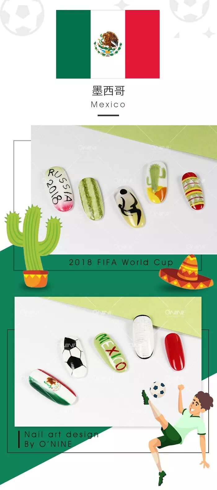 如果你去过墨西哥,一定能感受到那里浓烈的色彩。这次的球衣以绿色为主色,而两款美甲款式结合墨西哥的国旗色彩,元素较为丰富。仙人掌、踢球小人、还有大大的MEXICO,这种画风你喜欢吗?