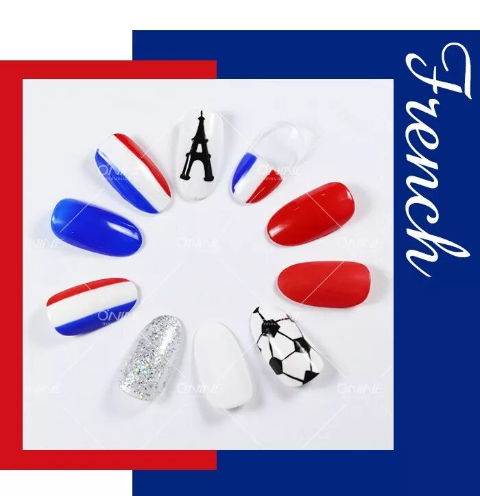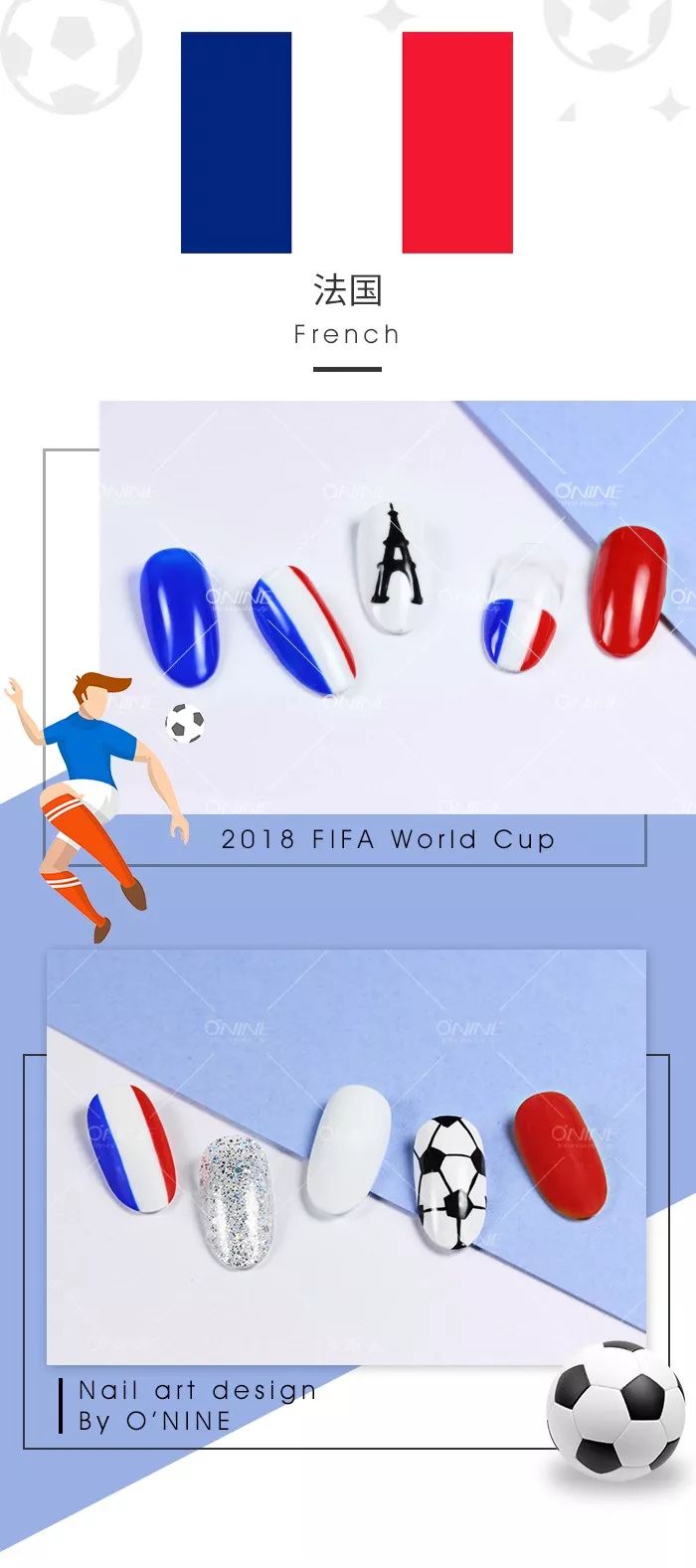 法国经典的红白蓝,清爽的白色、热烈的红色及浪漫的蓝色,让这两款美甲散发独特的魅力。著名地标艾菲尔铁塔迷你可爱,独树一帜,红色的运用,闪闪的银色珠光,期待蓝色军团之后的表现。